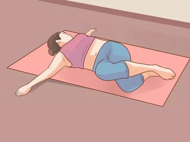 深深吸气,打开胸腔,从腰部开始,将下背部转向一侧,上背部保持贴向地板,吐气,放松。
