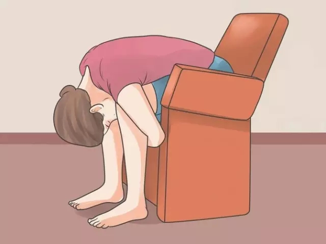 这个动作能够全面拉伸到背部、颈部和肩部。首先,坐在椅子的边缘部位,注意如果你坐的是转椅,就把椅子靠在墙上,以防滑动。俯下身体,让胸部贴近膝盖,两臂自然下垂。接下来将手放在腿后面,用右手抓住左侧腰部、前臂,或是胳膊肘。