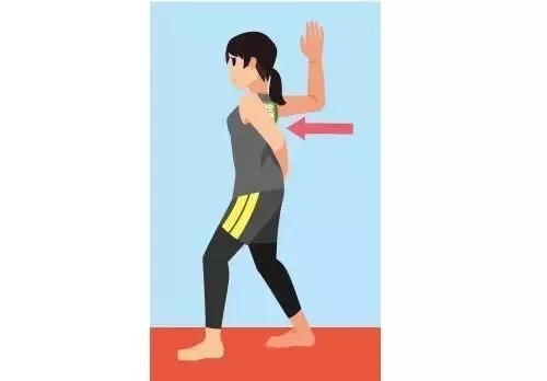 抬起一只手,打开向后伸展,另一只手放在伸展开的那只手的手臂根部与胸部的旁边,用轻微的力道施压同时按揉。