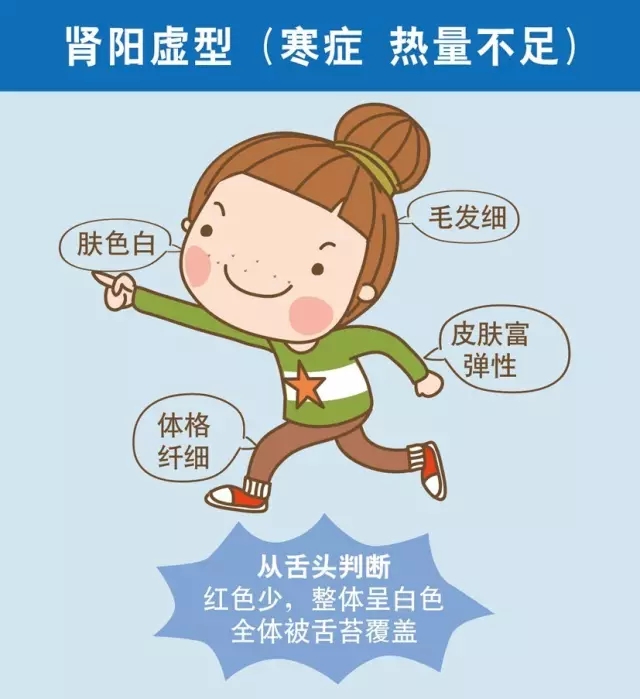 惧寒,肤色白且体格纤细的人,有可能是阳气不足。此种体质的人缺乏体力,肌肤因含有水分显得有弹性,头发细且薄为其特征,原因可能是先天性或是后天性肾阳原料(肾的热源)的不足。由于肾精不足会导致牙齿及骨骼疏松,耳鸣与目眩。
