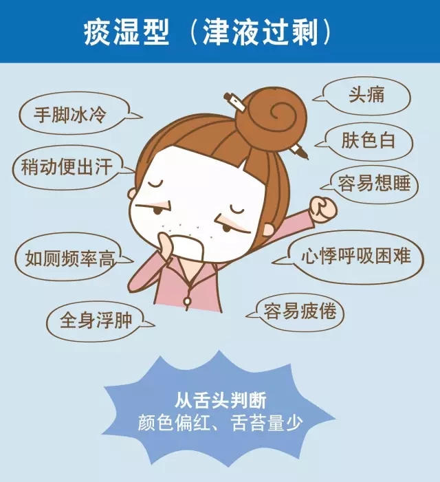这类体质的人习惯摄取大量水分,如厕频率也高。症状有容易疲态、稍微动一下便出汗、并感到呼吸困难或心悸。由于痰湿会妨碍气血的流动,因此也会造成手脚无力、头痛、目眩、手脚冰冷、下痢、嗜睡等症状。