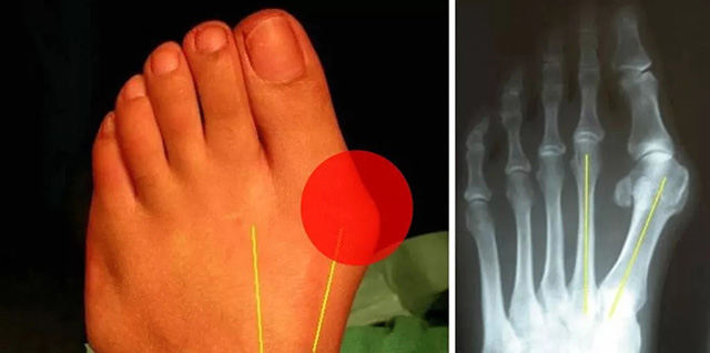小朋友的足弓一般是三岁左右开始出现的,如果足弓发育不好受力线的影响会影响小朋友的走路姿势及平衡,甚至会导致拇外翻。拇外翻如下图: