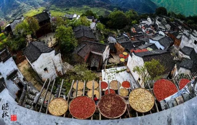 晒秋是一种典型的农俗现象,具有极强的地域特色。在湖南、江西、安徽等生活在山区的村民,由于地势复杂,村庄平地极少,只好利用房前屋后及自家窗台、屋顶架晒或挂晒农作物,久而久之就演变成一种传统农俗现象。