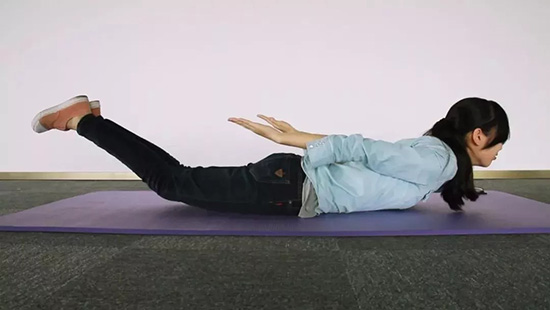 2、燕展翅俯卧,双手背向放好,膝盖伸直,头和腿都尽量向上翘。坚持5秒,然后放松,如此重复15遍为一组。每天2次,每次3组。