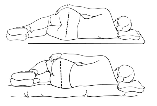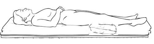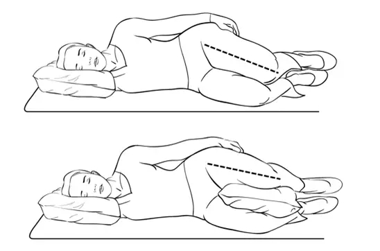 侧卧睡可能会导致肌肉失衡和疼痛。如果你习惯侧卧睡,可以双腿蜷缩略向上,超过胸部,然后在两膝之间放一个枕头(如下所示)保持臀部,骨盆和脊椎对齐。枕头需延伸到颈部,这样对颈椎可以形成稳定的支撑。