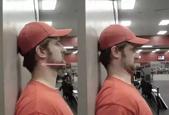 可以采用简单有效的“缩下巴”大法,身体靠墙,体会“下巴回缩”的感觉;