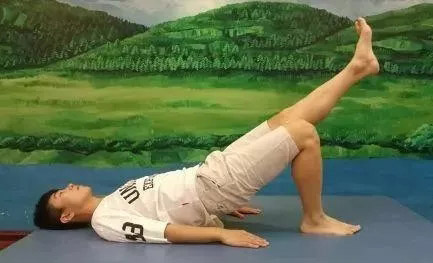 第四式:仰卧位,一腿屈膝全脚掌着床,另一腿伸直抬起,然后尽力使臀部远离床面,保持6-15秒。重复10~20次。