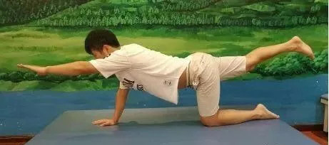 第十式::一侧膝盖与对侧手掌着床,另一侧下肢及上肢保持伸直状态,保持6-15秒,左右互换,重复5-10次。