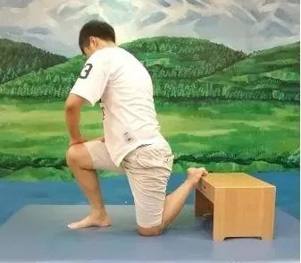 第十一式:一侧下肢膝盖着床,小腿向内收,脚面搭在凳子上,另一腿屈膝90度,脚掌着床,双手放在前面腿的膝盖上,然后躯干向前面腿的同侧弯曲,下方大腿外侧感到明显牵拉停止,保持6-15秒。左右互换,重复5-10次。注:这个动作难度较大,可选择性做。