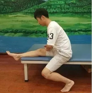 第十二式:一侧腿放于床面上,脚踝放于床缘外侧,双手放在大腿上方,躯干伸直前屈,大腿后部肌群有明显牵拉感停止,保持6-15秒。左右互换,重复5-10次。