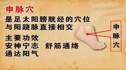 申脉穴是阳跷与太阳膀胱经交会的重要穴位,它的取穴法也很简单,在外踝骨正下的凹陷处。人体受到寒邪之后会缩成一团,瑟瑟发抖,这在中医里叫做“拘急收引”,而申脉穴有伸展脉络之意,可以快速调动人体阳气,阳气足则寒邪自散。