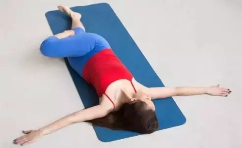 03、仰卧脊柱扭转仰卧在垫面上,屈右膝将右脚放在左大腿上,双手侧平举,掌心朝下,呼气身体向左扭转,保持双肩在垫面上,转头眼睛看向右手指尖的方向,保持3-5个呼吸,换另一侧可重复练习5-8组 。