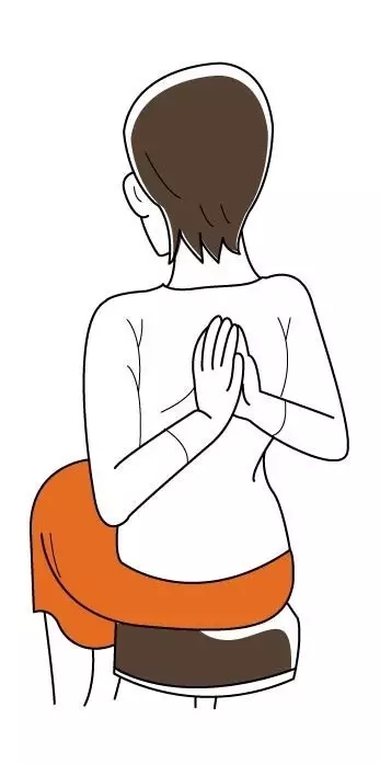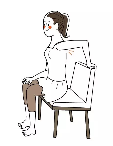 肩胛骨归位运动身体面向正面,手往后抓住椅背,手肘弯曲呈直角。在此状态下把肩胛骨往脊梁骨靠近,并深呼吸3次。