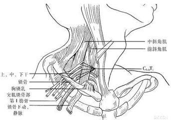 二, 解剖:前斜角肌起点、到C3-6颈椎横突的前面,止点、到第一肋骨的上缘里面,被胸锁乳突肌所覆盖,神经支配:c4-6(也有认为c3-4,或者c5-7)。中斜角肌 起于、到c2-7颈椎横突后面(也有认为C1-6的颈椎横突前结节),止于、到第一肋骨的上缘外面(锁骨上窝中外侧),神经支配:C3-8(也有认为C3-4,或者C5-7)。后斜角肌 起于、到C5或者C6和C7的颈椎横突后面,止于、到第二肋骨的外侧面,甚至到第三肋骨,神经支配:C6-8(也有认为C4-5或者C7-8).小斜角肌 大部分可见但并不是所有的人,起于、第C7颈椎横突前面,止于、胸膜顶和第一肋骨内缘。