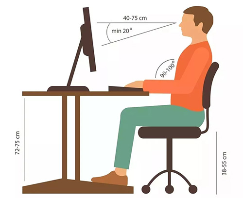 端正并保持坐姿正确的坐姿应该如下图所示,上半身靠椅背,髋部成角略大于90°,膝部成角90°,足踝与地面成角90°,保持全身重心稳定。
