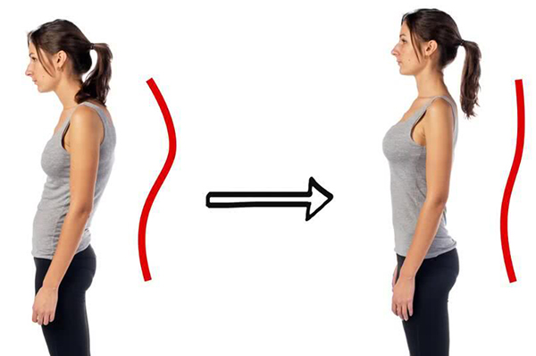 完美的姿势应该是:整个躯干呈哑铃型曲线。下巴微微收紧,背柱伸直,挺胸部,腰凹陷。