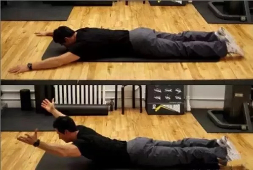 脸朝下平躺与地面,双腿与肩同宽,双臂高举过头,成Y字状,将手臂与头部尽量抬离地面,同时手向上旋转,手心向上,保持这个姿势5-10秒,重复进行8-10次,重复3组。