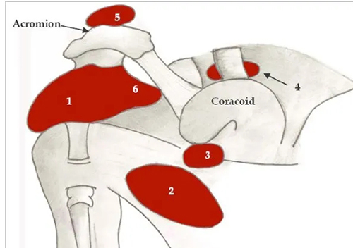 滑囊是骨骼与骨骼、骨骼与肌肉、肌肉与肌肉之间普遍存在的润滑结构,肩关节中共有6处滑囊。
