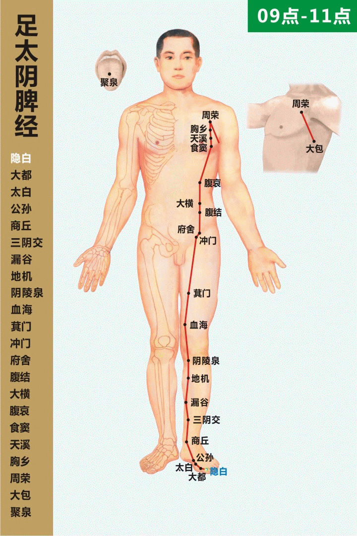 4、足太阴脾经巳时(9点至11点)—脾经旺。巳时脾经旺,造血身体状;“脾主运化,脾统血。”脾是消化、吸收、排泄的总调度,又是人体血液的统领。“脾开窍于口,其华在唇。”脾的功能好,消化吸收好,血液质量好,所以嘴唇是红润的。唇白标志血气不足,唇暗、唇紫标志寒入脾经。