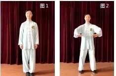预备势 动作一:两脚并拢,下颏微收,唇齿合拢,舌尖放平,轻贴上腭,竖脊含胸,两臂自然下垂,目视前方(图 1)。