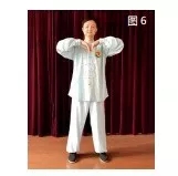 动作三:两膝缓缓伸直;同时屈肘,两掌捧至胸前,掌心向内,两中指约与下颏同高; 目视前下方。两肘外展,约与肩同高;同时, 两掌内翻,掌指朝下,掌背相靠(图 6)。