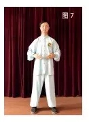 动作一:接上式。当上式最后一动两掌向前拨出后,外旋内翻,转掌心向内对肚脐,指尖斜相对,五指自然张开,两掌心间距与掌心至肚脐距离相等;目视前下方。 然后,两膝缓缓伸直,同时,两掌缓缓向肚脐方向合拢,至肚脐前约 10 厘米(图 7)。