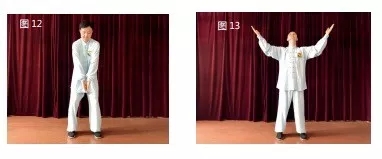 动作二:两膝缓统仲直;同时,提肘带手,经体前上提至胸。 随后,两手继续上提至面前,分掌、外开、上举,两臂成弧形,掌心斜向上;目视前上方(图 13)。