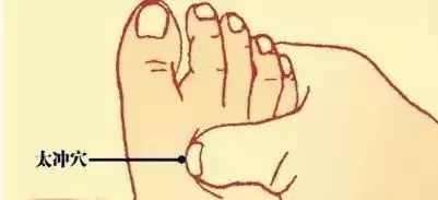 按太冲穴盘腿端坐,用左手拇指按右脚太冲穴(脚背第一、二趾骨之间),沿骨缝的间隙按压并前后滑动,做20次。然后用右手按压左脚的此养生穴位,手法同前。