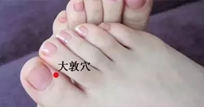 揉大敦穴盘腿端坐,赤脚,用左手拇指按压右脚的大敦穴(脚大趾甲根部外侧),左旋按压15次,右旋按压15次。然后用右手按压左脚的此养生穴位,手法同前。