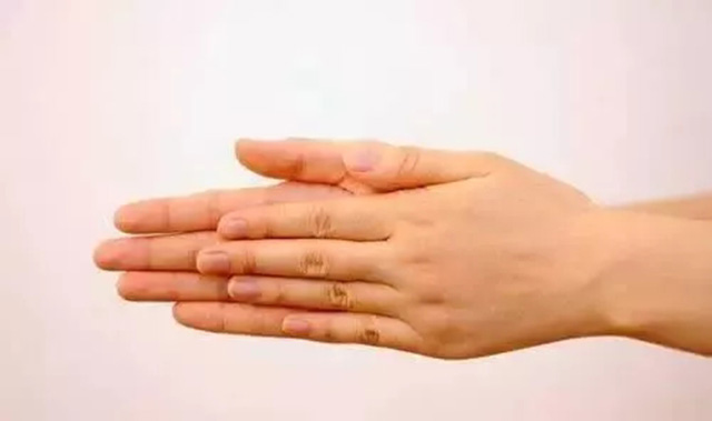 两手伸直,手心相对,上下搓,前后揉,然后两手做“负阴抱阳”的动作——右手包着左手。