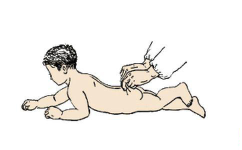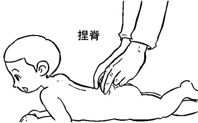 食指半屈,用双手食指中节靠拇指的侧面,抵在孩子的尾骨处;大拇指与食指相对,向上捏起皮肤,同时向上捻动。两手交替,沿脊柱两侧自长强穴(肛门后上3~5厘米处)向上边推边捏边放,一直推到大椎穴(颈后平肩的骨突部位),算做捏脊一遍。