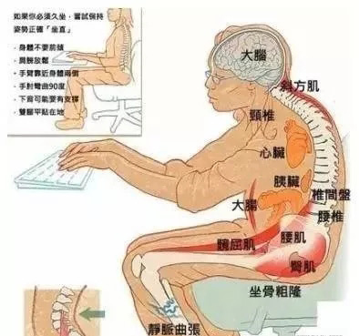 祖国医学早就认识到"久坐伤肉"。久坐不动,气血不畅,缺少运动会使肌肉松弛,弹性降低,出现下肢浮肿,倦怠乏力,重则会使肌肉僵硬,感到疼痛麻木,引发肌肉萎缩。祖国医学早就认识到"久坐伤肉"。对于肩颈部和腰部的肌群而言,长时间保持一个姿势容易绷紧并变得僵硬,影响到椎动脉对头部的供血,引起头晕。