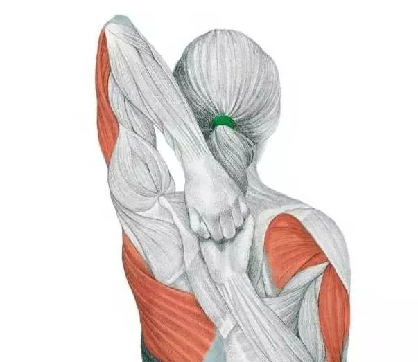 肌肉:手臂肱三头肌、大臂内旋外旋肌 如何拉伸 :一手从肩膀上方绕过来,一边从肩膀下方向上绕;双手相互抓住。