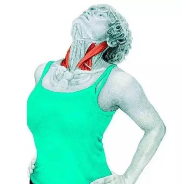 肌肉 :胸锁乳突肌拉伸 :脖子往一侧转动,下巴稍微抬高,分离胸锁乳突肌;想加强拉伸,可以用手去帮忙转动。