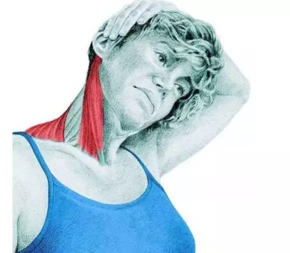 肌肉 :胸锁乳突肌、上斜方肌拉伸 :手放在对侧耳朵上,头往手那侧倒,耳朵靠肩膀;脖子保持有力不塌陷,右肩膀下沉。