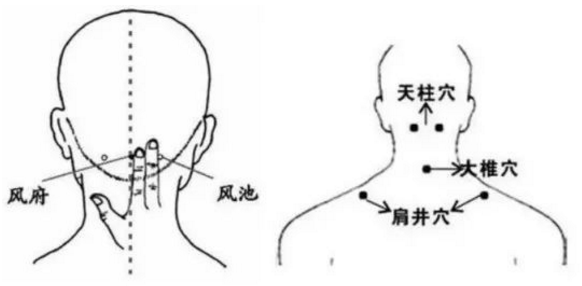 穴位选择穴位颈项部:风池、风府、天柱、大椎。肩背部:肩井。上肢部:曲池、合谷。