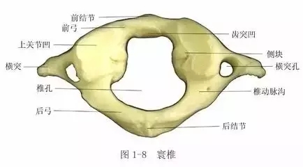 寰椎即第一颈椎,因为像个“环”一样,所以叫 huan 椎,直接与枕骨相连,没有椎体和棘突,由前后弓和侧块组成。