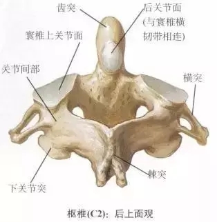 枢椎即第二颈椎。它和一般的颈椎相似,但椎体上方有齿状的隆突称为齿突,此齿突可视为寰椎的椎体。齿突根部的后方,有寰横韧带,但此韧带较细小;齿突前面有一关节面与寰椎前弓构成寰齿关节。