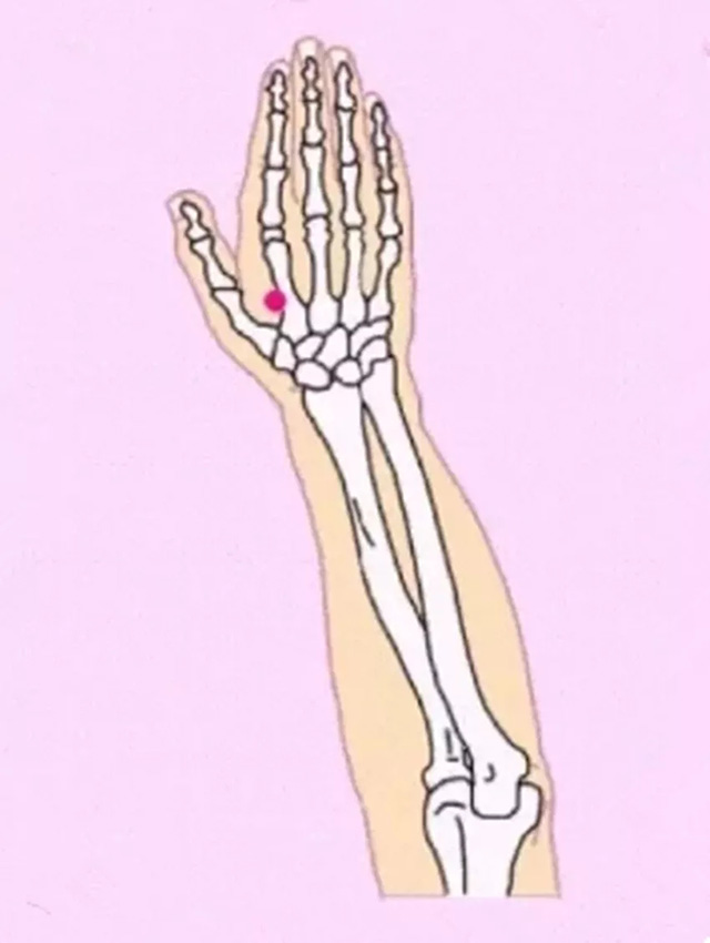 掐摁图中的位置,在第二掌骨上,和合谷穴平行的地方。轻微按压,感觉酸酸胀胀即可,力度不要太重,以不感觉疼为准。