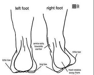我们走路一般都有一个足偏角,如上图所示,中间为正常,两侧为异常。如果不加以纠正,很可能会导致走路姿势异常。