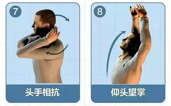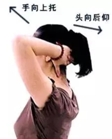 7、双手交叉紧贴颈后,用力顶头颈,头颈向后用力,相互抵抗5次。